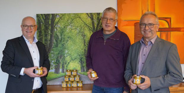 Das Bild zeigt von links nach rechts: Joachim Wagner, Vorstand der Volksbank Lauterecken eG, Karlheinz Groß, Vorsitzender des Imkervereins Glanbrücken, Harald Gabriel, Vorstand der Volksbank Lauterecken eG